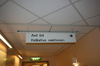Men det är med döden närvarande. Palliativa avdelningen på sjukhuset. Alla som ligger här håller på att dö och för att R skulle få plats krävdes att en person dog. Man får nämligen köa in till avdelningen eftersom det är fullt och plats ges bara när någon avlidit. Men det är lugnare än den förra avdelningen. Personalen är väldigt lugn, mjuk och go. De är otroligt fina med R som nu behöver hjälp med allt. Han får precis vad han vill ha.