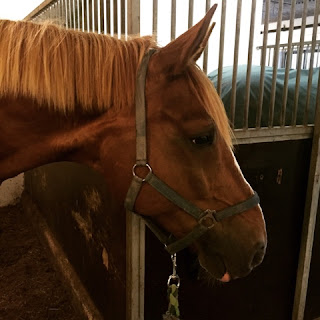 Var både trött och lite lebruten efter ridningen och hade ett trist skavsår på fingret efter tygeln då jag ridit med trasiga ridvantar. Klen hud helt enkelt. Men fick tips att tejpa fingret inför lördagens lektion i hoppspecialen och det hjälpte. Red en kul och kämpig lektion på Lyrik och fick testa ett nytt bett på honom vilket innebar att jag inte behövde ta så mycket i honom. Han är väldigt stark annars och jag har ridit honom på vanligt tränsbett och tredelat tränsbett tidigare så det var stor skillnad med det nya gummipelhambettet. Nu får vi se hur han trivs med det och hur jag rider med det eller om vi ska växla tillbaka.