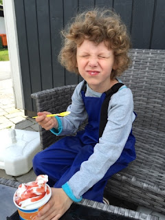 Vi hade bestämt att vinnaren skulle bjuda på glass så efter spelet som jag till Widars besvikelse vann så bjöd jag på glass och då blev han onekligen gladare. Litens nya favorit den här sommaren är mjukglass med jordgubbssås, något han alltid har plats för i magen menar han =)